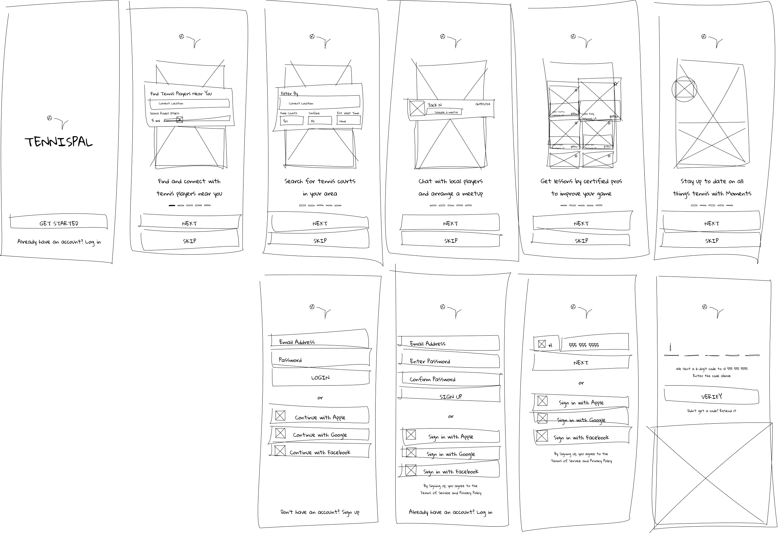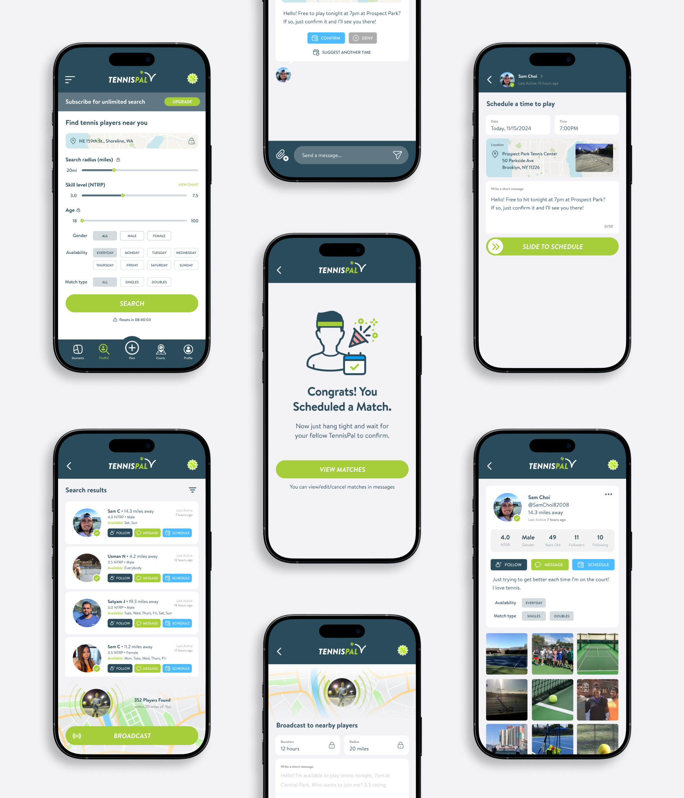 As a UX Consultant for TennisPal, I collaborated with the CEO to strategize and brainstorm ways to increase paid subscriptions and help scale the app. I leveraged my experience as both a designer and an avid tennis player to improve the app from a user perspective and add new features that I know tennis players would use and love. I started by streamlining the onboarding process of the existing app and conceptualizing a Match Scheduling feature to enhance usability and boost retention.