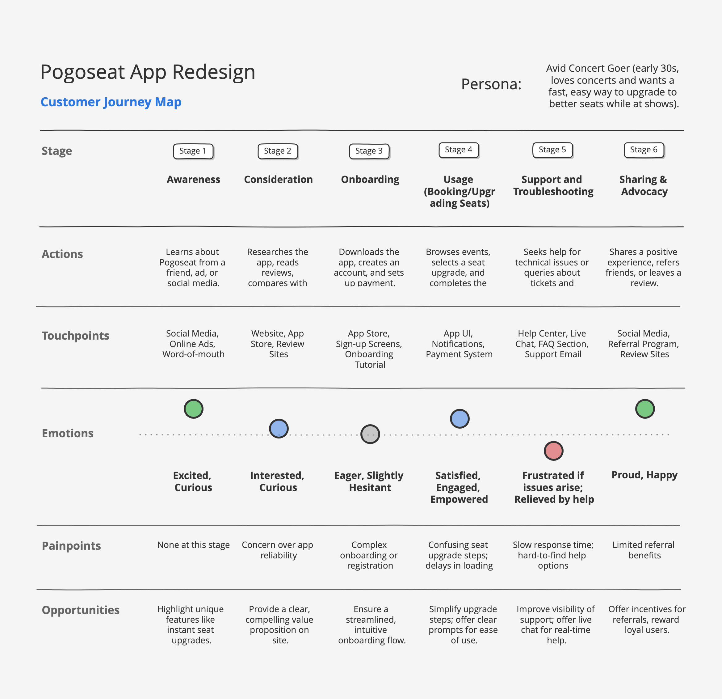 The Pogoseat redesign had a immediate impact in boosting user engagement and revenue. A memorable moment came when a user shared how an effortless seat upgrade transformed their night at a concert, reminding me why I love what I do.This project highlighted the importance of deeply understanding user needs and addressing specific issues with targeted solutions. Empathy and early user feedback were crucial in aligning the design with expectations, while the process emphasized adaptability and continuous improvement to create meaningful, impactful solutions.