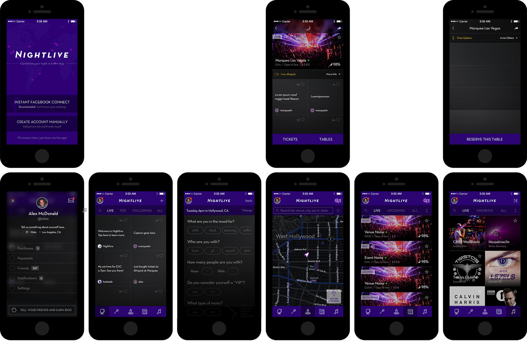 Nightlive was a concept I created in 2014 for a mobile app aimed at helping party-goers connect and discover nightlife hotspots in real time. The goal was to build a social platform that gave users live updates on venues, crowds, and trending events nearby. Though the project didn’t move past the concept stage, it served as a creative exploration into location-based, real-time UX.
